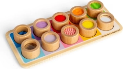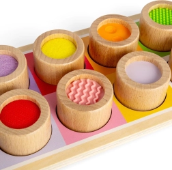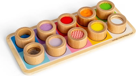 Deze geweldige sensorische plaat is een perfecte manier om kinderen kennis te laten maken met verschillende texturen en kleuren. Het bevat een houten bord met gekleurde openingen en elf insteekstukken, elk met een unieke afwerking, van geribbeld siliconen tot zachte vilt. Dit speelgoed helpt niet alleen onderscheid te maken tussen verschillende texturen, maar bevordert ook de hand-oogcoördinatie.