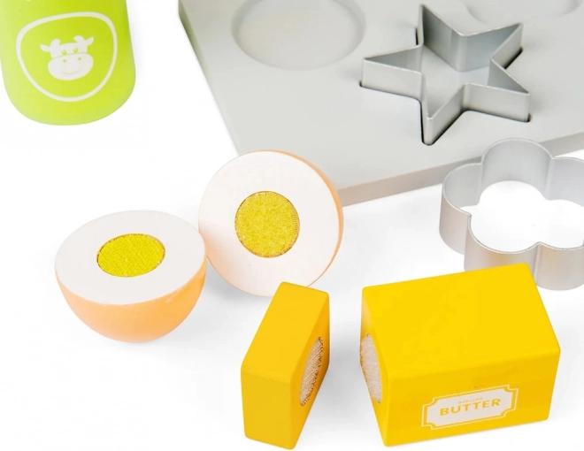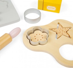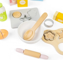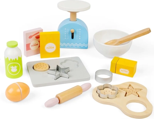 Met deze houten bakset voor kinderen bezorg je ze uren speelplezier en stimuleer je tegelijk hun verbeelding. De set bevat een houten bakplaat, weegschaal, uitsteekvormpjes, deegroller, kom, boter, ei, bloem, suiker en melk. Keukenveiligheid leren ze spelenderwijs.
