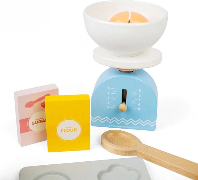 De set biedt alles wat een kleine bakker nodig heeft: bakplaat, weegschaal, kom, deegroller, uitsteekvormpjes en meer.