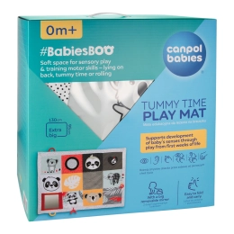 De sensorische educatieve speelmat Canpol babies voor tummy time uit de BabiesBoo-collectie is een veilige en aangename manier om je baby in beweging te houden en geeft ouders even tijd voor zichzelf of voor huishoudelijke taken. De mat is uitzonderlijk groot en zacht – 130 x 95 cm biedt je kleintje comfort en veiligheid. De educatieve mat van Canpol babies is gemakkelijk op te vouwen, heeft een handige draaggreep waardoor hij eenvoudig te dragen is, zodat je overal waar nodig een kinderhoek kunt creëren. De grote spiegel stimuleert en verlengt de tijd op de buik, waarbij je baby telkens verschillende delen van de mat kan verkennen. Talrijke zintuiglijke elementen prikkelen de zintuigen van het kind: zicht, gehoor en tast. Diverse materiaaltexturen, contrasterende kleuren en patronen en zachte geluiden zorgen voor geweldig vermaak voor de zich ontwikkelende zintuigen van je baby vanaf de allereerste levensmomenten. De sensorische leerzame mat van Canpol babies helpt de juiste motorische ontwikkeling van elk kind te ondersteunen. De mat is wasbaar in de wasmachine.Kinderhoek overal waar we die nodig hebben.Aanbevolen door fysiotherapeut Magdalena Zujewicz – kinderfysiotherapeut, opvoeder en SI-therapeut.Uitzonderlijk grote en zachte mat biedt je baby comfort en veiligheid.De grote spiegel wekt de interesse van de baby en verlengt de tijd die op de buik wordt doorgebracht.Veel elementen die de zintuigen van het kind betrekken: zicht, gehoor en tast.Eenvoudig op te vouwen dankzij de comfortabele handgreep die het dragen vergemakkelijkt.Contrasterende kleuren en patronen ondersteunen de ontwikkeling van het gezichtsvermogen van het kind.Ondersteunt de ontwikkeling van de tast en traint de fijne motoriek.Verbetering van hand-oogcoördinatie en audio-motorische coördinatie.Gemakkelijk schoon te houden – machinewasbaar.Ideaal voor kinderen vanaf de eerste levensmomenten.Het speelgoed is gemaakt van veilig materiaal zonder bisfenol A.Afmetingen van de mat: 130 x 95 cmGebruiksaanwijzing:De wijze van reinigen staat op het etiket vermeld. Was de mat, met uitzondering van de spiegel, in de wasmachine op maximaal 30°C op een fijnwasprogramma. Houd de speelmat schoon. Was de speelmat, behalve de spiegel, in de wasmachine bij max. 30°C met een delicaat programma. Gebruik een milde wasmiddel speciaal voor baby’s. Apart wassen. Veeg de spiegel af met een vochtige doek. Verwijder de beschermfolie van de spiegel.Waarschuwing! Belangrijk voor de gezondheid en veiligheid van je kind! Controleer vóór elk gebruik zorgvuldig. Vervang versleten/beschadigd speelgoed door nieuw.Waarschuwing! Uit de buurt houden van open vuur. Bewaar de handleiding voor later gebruik.De mat voldoet aan de eisen van:Richtlijn 2009/48/EG van het Europees Parlement en de Raad inzake de veiligheid van speelgoedEN 71 - 1 Speelgoedveiligheid - Deel 1: Mechanische en fysieke eigenschappenEN 71 - 2 Speelgoedveiligheid - Deel 2: OntvlambaarheidEN 71 - 3 Speelgoedveiligheid - Deel 3: Migratie van bepaalde elementen
