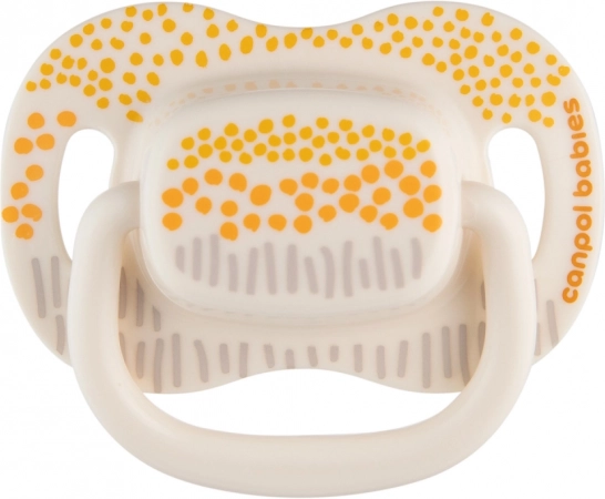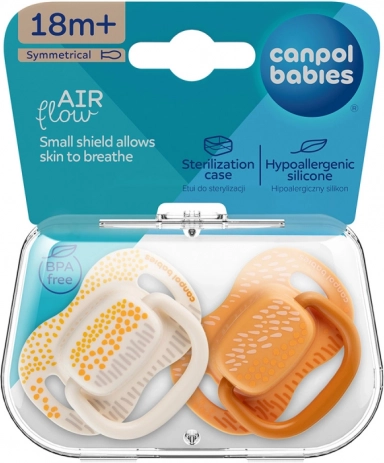Praktische set van twee CANPOL BABIES fopspenen met een symmetrische siliconen speen voor kinderen vanaf 18 maanden. Gemaakt van hypoallergeen, smaak- en geurloos siliconen, met een geventileerd schild voor een ademende huid en een moderne capsule voor snelle desinfectie in de magnetron. De fopspenen zijn vormvast, eenvoudig schoon te houden en vrij van BPA.