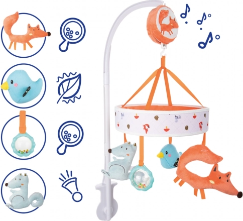 De kleurrijke mobiel voor boven het ledikant met schattige pluchen diertjes uit de FOX-collectie trekt de aandacht van je baby en creëert een prettige bedtijdroutine. Het handmatig opwindbare mechanisme speelt kalmerende melodieën die je kind geruststellen en helpen bij het makkelijk inslapen – zonder batterijen.