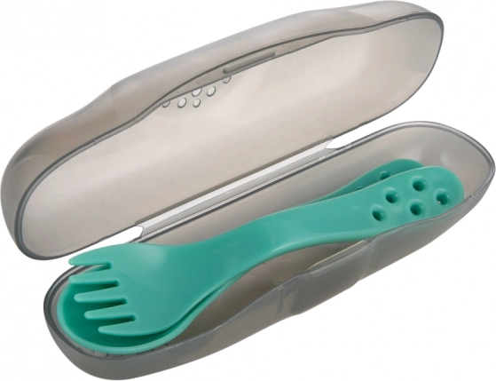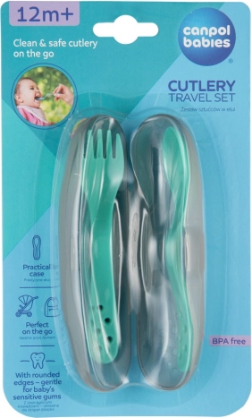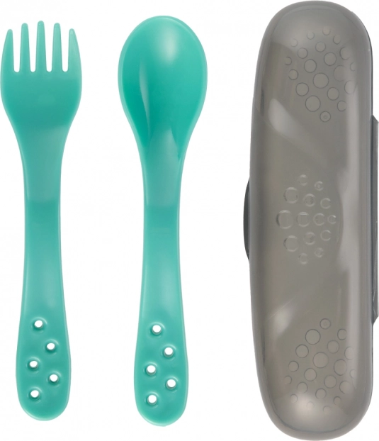 Praktische reisset met bestek van CANPOL babies in elegant turkoois voor kinderen vanaf 12 maanden. Bevat een vork en een lepel in een compact etui. Gemaakt van veilig materiaal zonder BPA, met afgeronde randen voor zacht voeden. Ideaal voor wandelingen, uitstapjes en dagelijks gebruik, gemakkelijk te reinigen in de vaatwasser.