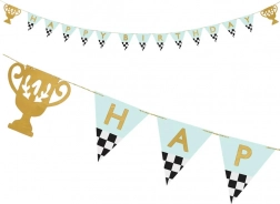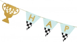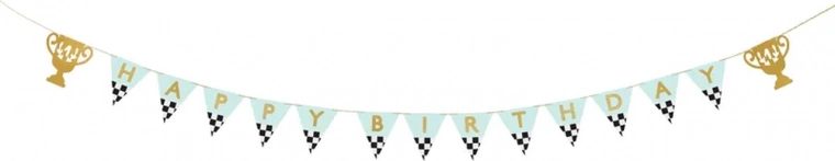De banner heeft lichtblauwe en zwart-witte geruite patronen, die samen met de trofeeën een sportieve look geven. Geschikt voor zowel kinder- als volwassenfeesten.