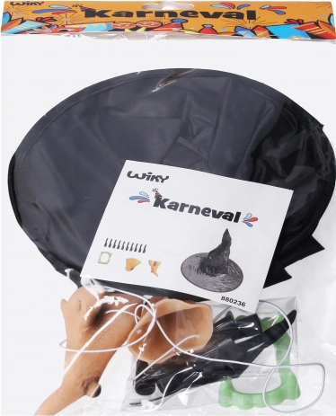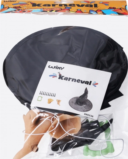 Complete heksenset voor elk feest, carnaval en Halloween. Bevat een grote hoed, kin en neus met elastiek, 10 opzetvingers met nagels en tanden, zodat je in enkele minuten een authentieke heksenlook creëert.