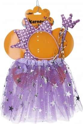 Betoverende carnavalsset fee paars: rok, haarband met versiering en toverstaf. Licht, comfortabel en ideaal voor carnaval en kinderfeestjes.