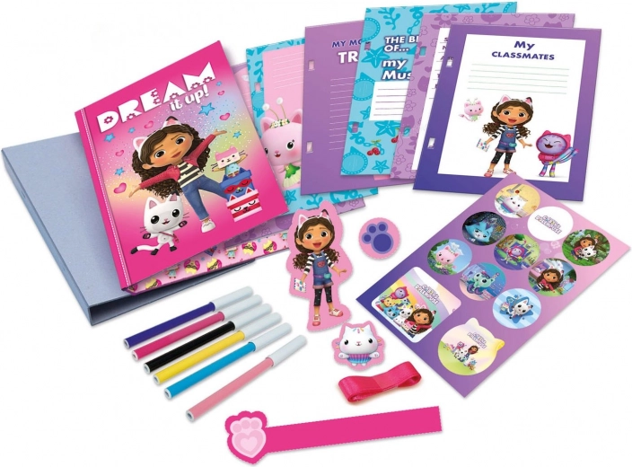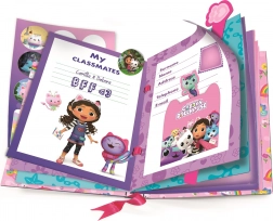 - Kartonnen kaften, gepersonaliseerde dagboekbladen, 27 voorgedrukte pagina’s (gedeeltelijk met Engelstalige teksten), Gabby-stickers, poster met decoratieve omslag, afbeeldingen en versieringen om uit te knippen, stiften, satijnen lint, geïllustreerde handleiding