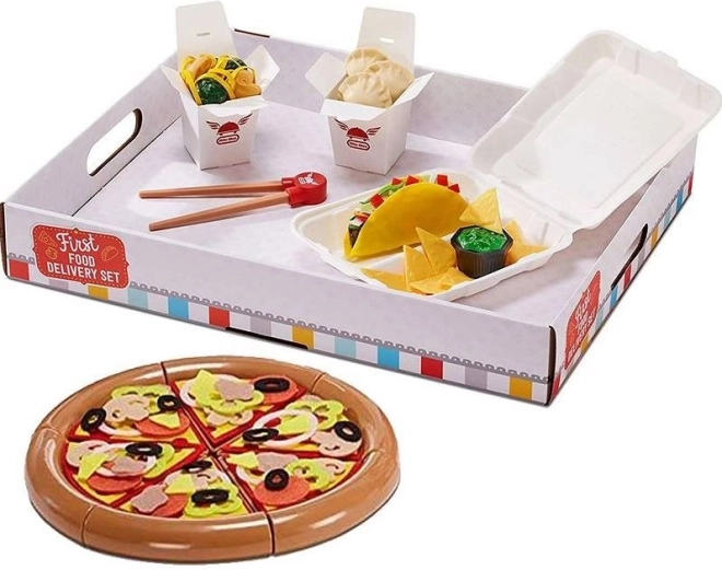Kinderen spelen koerier én klant, pakken menu’s in afhaaldoosjes en serveren alles op het blad dat wordt gevormd door de verpakking zelf. De realistische uitstraling van het eten en de mix van kunststof en vilten onderdelen maken deze set ideaal voor kooksimulatie en gezamenlijke etentjes met vriendjes.