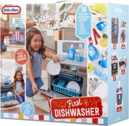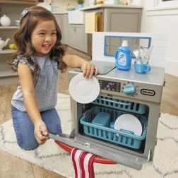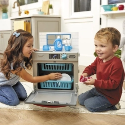 Kleine helpers zullen het realistische design van de grijze vaatwasser met rode accenten waarderen, die eruitziet als echte apparaten. Na het toevoegen van het “middel” en het draaien aan de functionele knop gaat het licht aan en starten authentieke wasgeluiden. Kinderen kunnen deurtjes openen, manden uitschuiven en servies in- en uitladen, waarbij ze hun motoriek en verbeelding ontwikkelen.