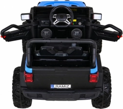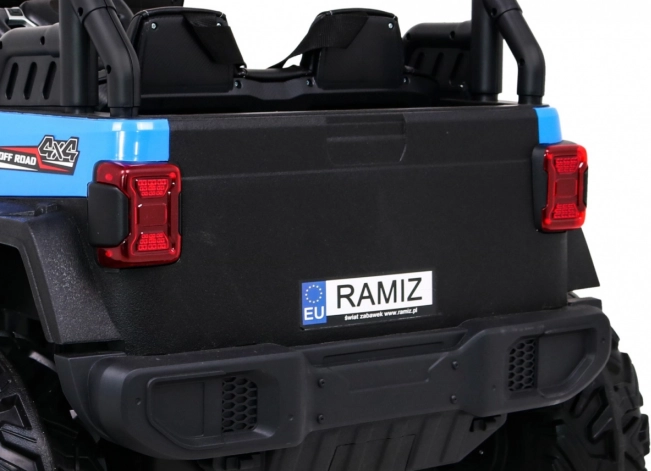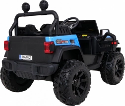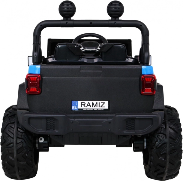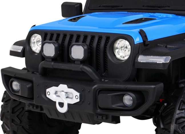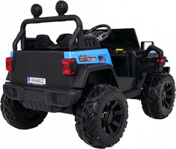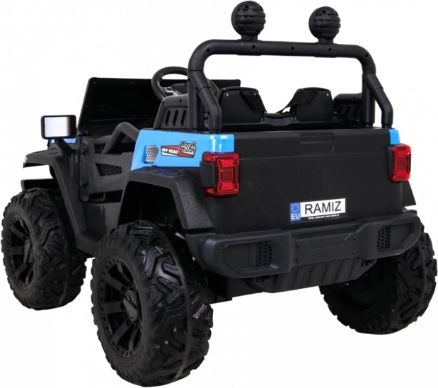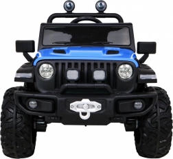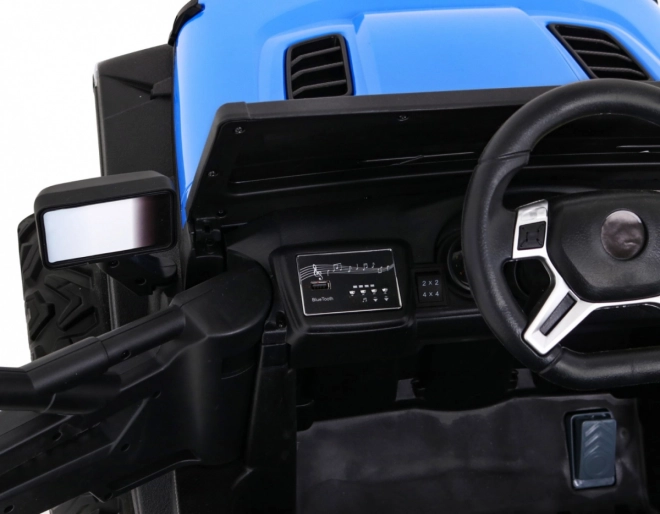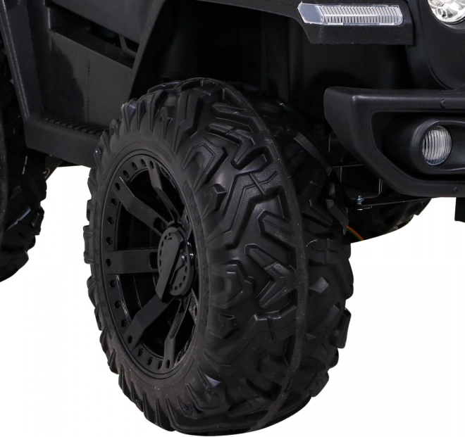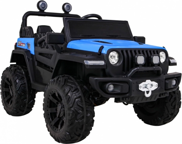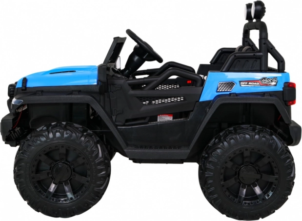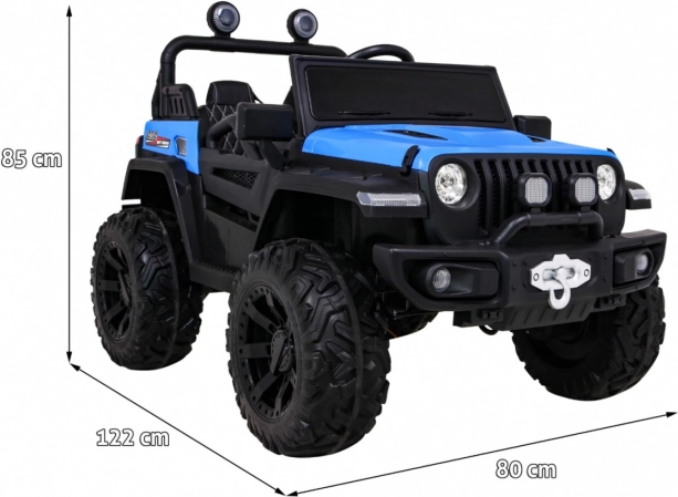 Robuuste elektrische kinderauto voor terrein met aandrijving 2x4 / 4x4, vier motoren 4×35 W en een accu 12 V / 10 Ah. Voorzien van zachte EVA-wielen, voor- en achter-LED-verlichting, een 2,4 GHz afstandsbediening met Stop-knop en uitgebreide audio: Bluetooth, MP3, USB, SD. Starten met een sleutel, te openen deuren met vergrendeling en een comfortabel eco-leren zitje met gordels voor een veilige en leuke rit.