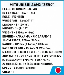 Mitsubishi A6M2 Zero is een gemakkelijk herkenbaar Japans jachtvliegtuig uit de Tweede Wereldoorlog, dat beroemd werd door deelname aan sleutelgevechten zoals de aanval op Pearl Harbor en de Slag bij Midway. De bouwset bevat 170 hoogwaardige stenen waarmee je een gedetailleerd model van dit legendarische vliegtuig kunt bouwen, met afneembaar landingsgestel.
