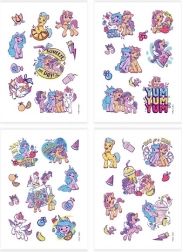 Ontdek de wereld van magische pony’s met de set MY LITTLE PONY tijdelijke tattoos. Elk van de 4 vellen biedt kleurrijke en schattige motieven die fans van de serie en kleine kunstenaars zullen verrukken. Aanbrengen gaat snel en veilig: plaats de gekozen afbeelding op de huid, maak vochtig, verwijder het papiertje en klaar.