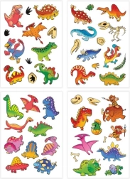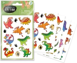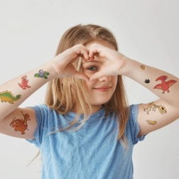 Ontdek de collectie tijdelijke tatoeages met favoriete dinosaurussen. Kinderen kunnen hun favoriete motief kiezen en zich in een oogwenk in dinofans veranderen. De tatoeages zijn gemakkelijk aan te brengen en te verwijderen en zijn perfect voor kinderfeestjes, kamp of als kleine attentie.