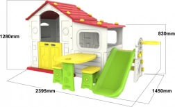 Afmetingen van het tuin speelhuis: Hoogte 128 cm, totale lengte 239,5 cm, en breedte van het speelhuis 108 cm, wat voldoende ruimte biedt voor kinderen van verschillende leeftijden.