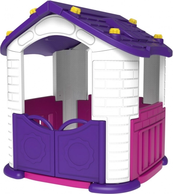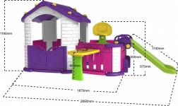 Dit ruime huisje biedt kinderen vrijheid en creativiteit tijdens het spelen. Grote openslaande deuren en een tweetraps veilige glijbaan met brede en stevige treden bieden veiligheid. De tuin is omsloten met een hek en heeft trappen die naar de glijbaan leiden, wat voor meer interactiviteit zorgt.