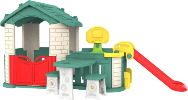 Groot 5-in-1 kinderspeelhuis biedt eindeloze uren fantasierijk spel. Inclusief glijbaan, basketbalring, tuintje met hek en een praktische tafel met twee stoeltjes.