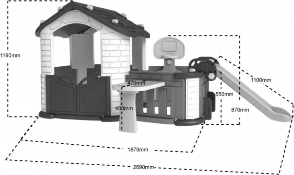 Het speelhuis biedt tal van speelmogelijkheden met een geïntegreerde glijbaan, basketbalring en een tuintje met hek.