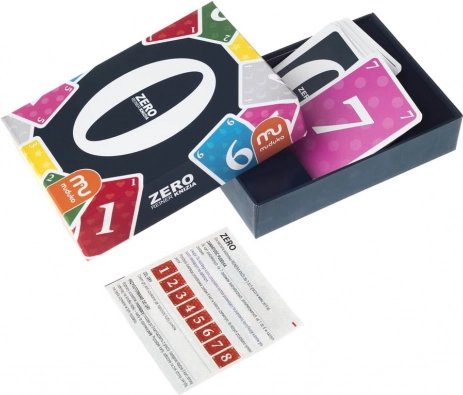 Zero is een kaartspel dat tactiek, geluk en opmerkzaamheid combineert. Het doel is duidelijk: zo min mogelijk punten behalen en streven naar de perfecte score: NUL. Dat is echter niet eenvoudig, want je moet sets completeren van kaarten in dezelfde kleur en sets met dezelfde waarde. Let goed op, zodat je aan het einde van de laatste ronde niet te veel kaarten overhoudt die in geen enkele set passen. Het is leuk in elke situatie en het kleine doosje past zelfs in je broekzak.