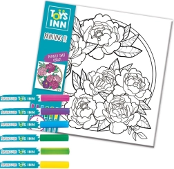 Ontdek een leuke creatieve set voor kinderen – een kleurplaat op canvas van 29 × 29 cm met stiften. Dankzij 6 gekleurde stiften maakt je kind een origineel en kleurrijk bloemenmotief, terwijl het fijne motoriek, creativiteit en geduld ontwikkelt.