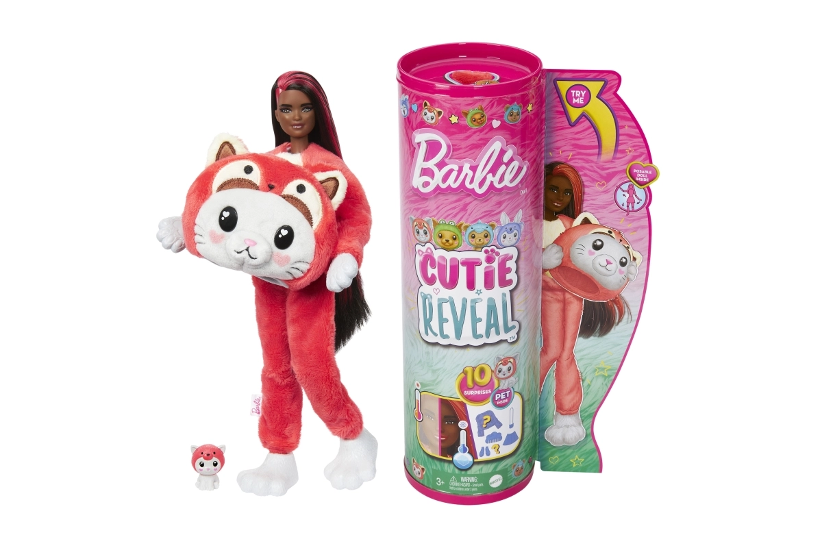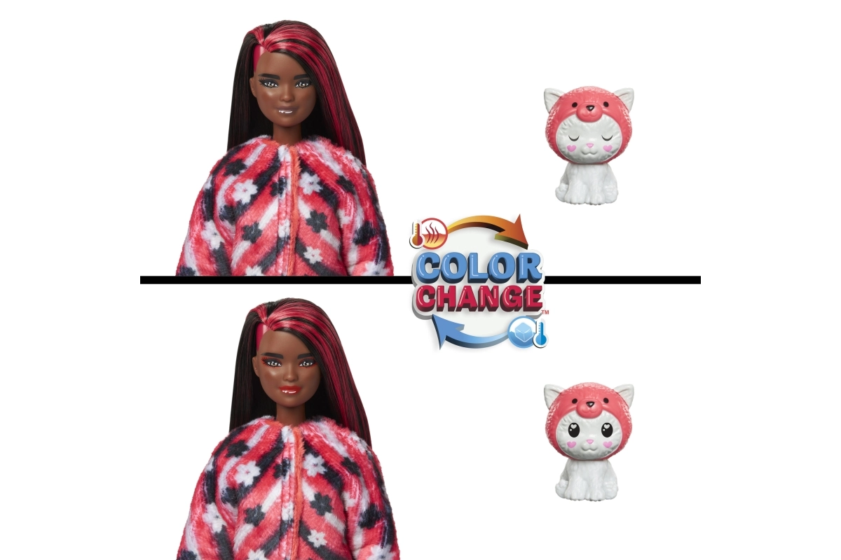 De Barbie Cutie Reveal-poppen uit de serie Gekostumeerde Diertjes bieden fantastische speelpret met 10 verrassingen! Je vindt er een dier verkleed als een ander dier. Ontdek een kat als rode panda, een hond als kikker, een beertje als dolfijn of een konijntje als koala. Trek het kostuum uit en onthul een Barbie-pop met lang haar die je in verschillende poses kunt zetten. Geniet van verrassingen zoals schoenen, een handtas en een mini-figuurtje van een huisdiertje. Keer het kostuum binnenstebuiten en het bovenstuk wordt een jas van extra zacht materiaal, en de kostuumkop verandert in een holletje voor het minidiertje. Ontdek een magische transformatie: met koud water verandert er kleur op het gezicht van de pop; met warm water keert ze terug naar haar oorspronkelijke look. Op deze manier kun je ook de look van het diertje veranderen! Kinderen zullen het geweldig vinden om de schattige verrassingen te ontdekken en de poppen uit deze Barbie Cutie Reveal-serie te verzamelen. Apart verkrijgbaar, afhankelijk van beschikbaarheid. Poppen kunnen niet zelfstandig staan. Kleuren en decoratieve elementen kunnen variëren.