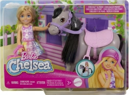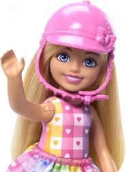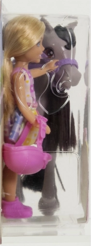 De Barbie Chelsea op een pony speelset brengt kinderen volop plezier en fantasie. Chelsea zet haar veilige roze helm op, neemt plaats in het comfortabele roze zadel en dankzij de buigbare knieën en stijgbeugels gaat ze op een stijlvolle rit. De grijze pony met een paars hoofdstel, zachte manen en staart is gemaakt voor verzorging en zacht aaien.