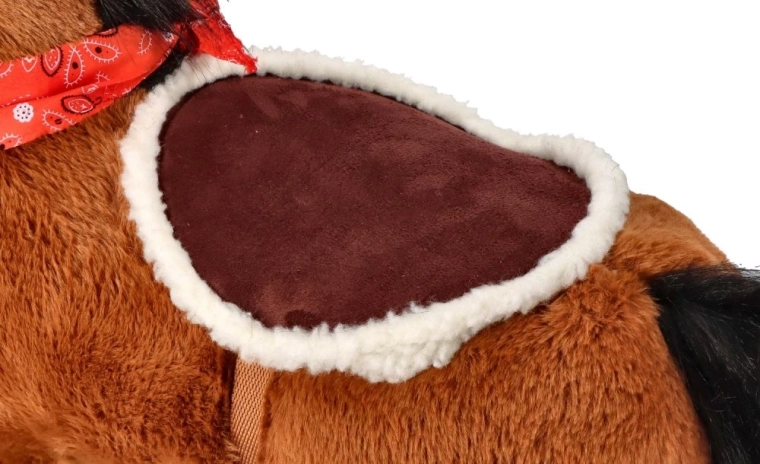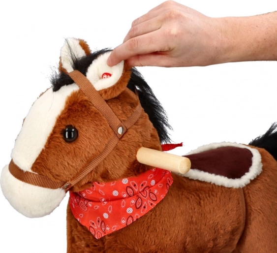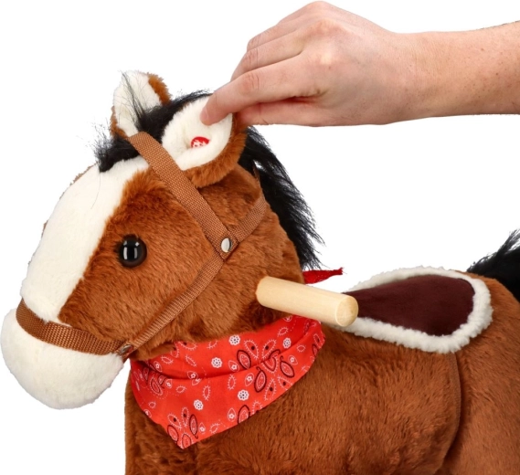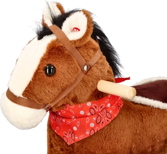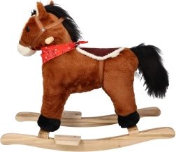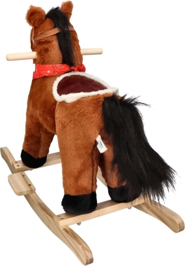 Schommelpony in bruine kleur met een zacht pluchen oppervlak, zadel en decoratieve sjaal is de ideale speelkameraad voor dagelijks gebruik. Dankzij de stevige houten schommelbasis kan het kind veilig schommelen, motoriek ontwikkelen en coördinatie oefenen.