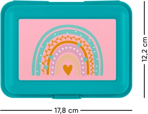 Deze broodtrommel heeft een kleurrijk regenboogdesign dat een vrolijke en speelse touch toevoegt aan elke lunch.