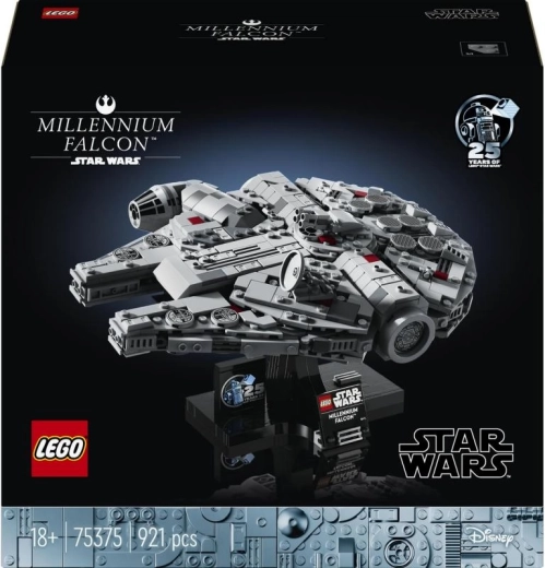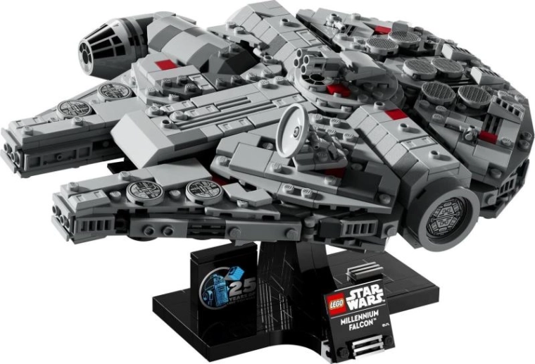 De stabiele basis toont de Millennium Falcon in vlucht en wordt aangevuld met een bedrukt bordje plus een 25-jaar LEGO Star Wars jubileumsteen.