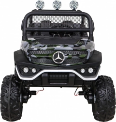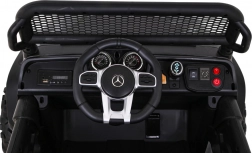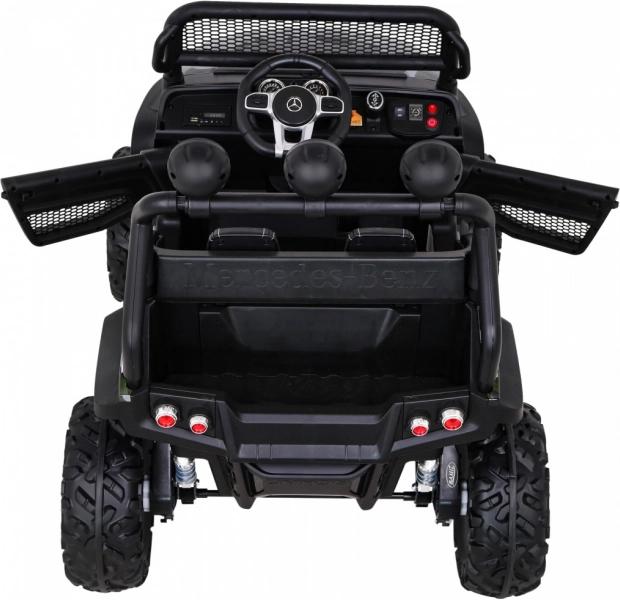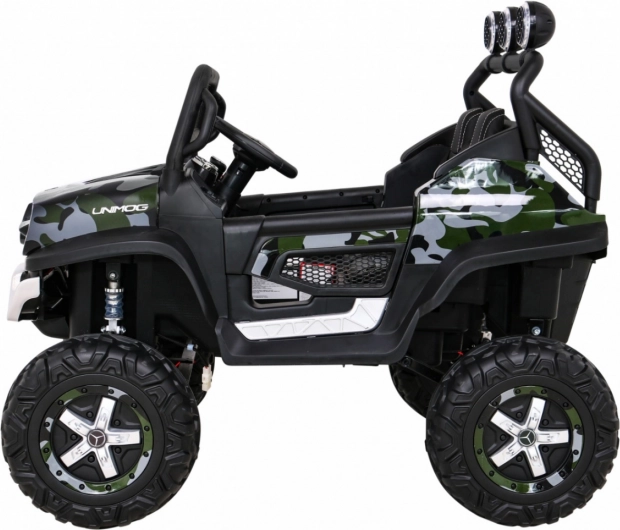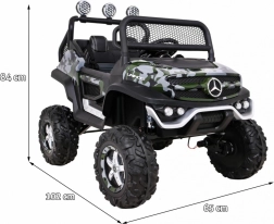 Wij presenteren de Mercedes Benz Unimog voor kinderen, die veiligheid en plezier combineert. Deze kinderauto valt op door zijn robuuste constructie, aangevuld met stijlvolle details geïnspireerd op echte terreinwagens. De 4x4-aandrijving is uitgerust met vier motoren van 35W, wat rijden op klinkers en gladde oppervlakken mogelijk maakt.