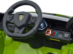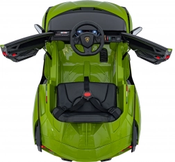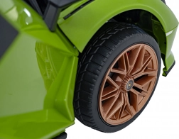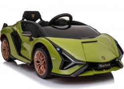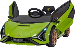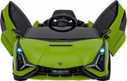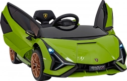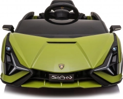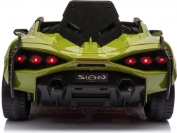Stijlvolle elektrische kinderauto Lamborghini Sian in het groen voor een realistische rijervaring. Uitgerust met 4 motoren (2×18 W voor, 2×35 W achter), een 12V/7Ah accu, EVA-schuimbanden voor stille ritten, soepele start en LED-verlichting. Ouders waarderen de 2,4 GHz afstandsbediening met noodknop Stop en kinderen genieten van het audiopaneel met USB/MP3/SD/AUX en claxon.