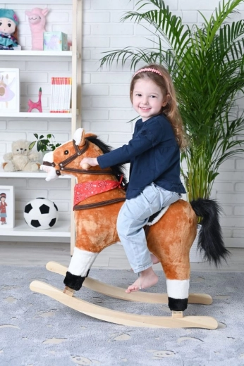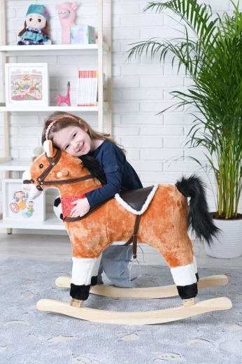 Het interactieve pluchen hobbelpaard combineert een zachte, aangename stof met een stevige constructie voor veilig en comfortabel schommelen thuis. De eenvoudige bediening van de geluiden ondersteunt fantasierijk spel en motiveert kinderen op een natuurlijke manier tot beweging.