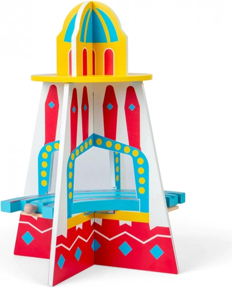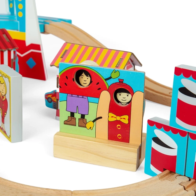 Deze houten treinbaan met kermisthema bevat alles wat je nodig hebt om je onder te dompelen in werelden vol plezier en vrolijkheid. Kinderen kunnen met de trein langs een circustent rijden, eendjes vangen of foto’s maken met grappige fotodecors. De set bevat:
