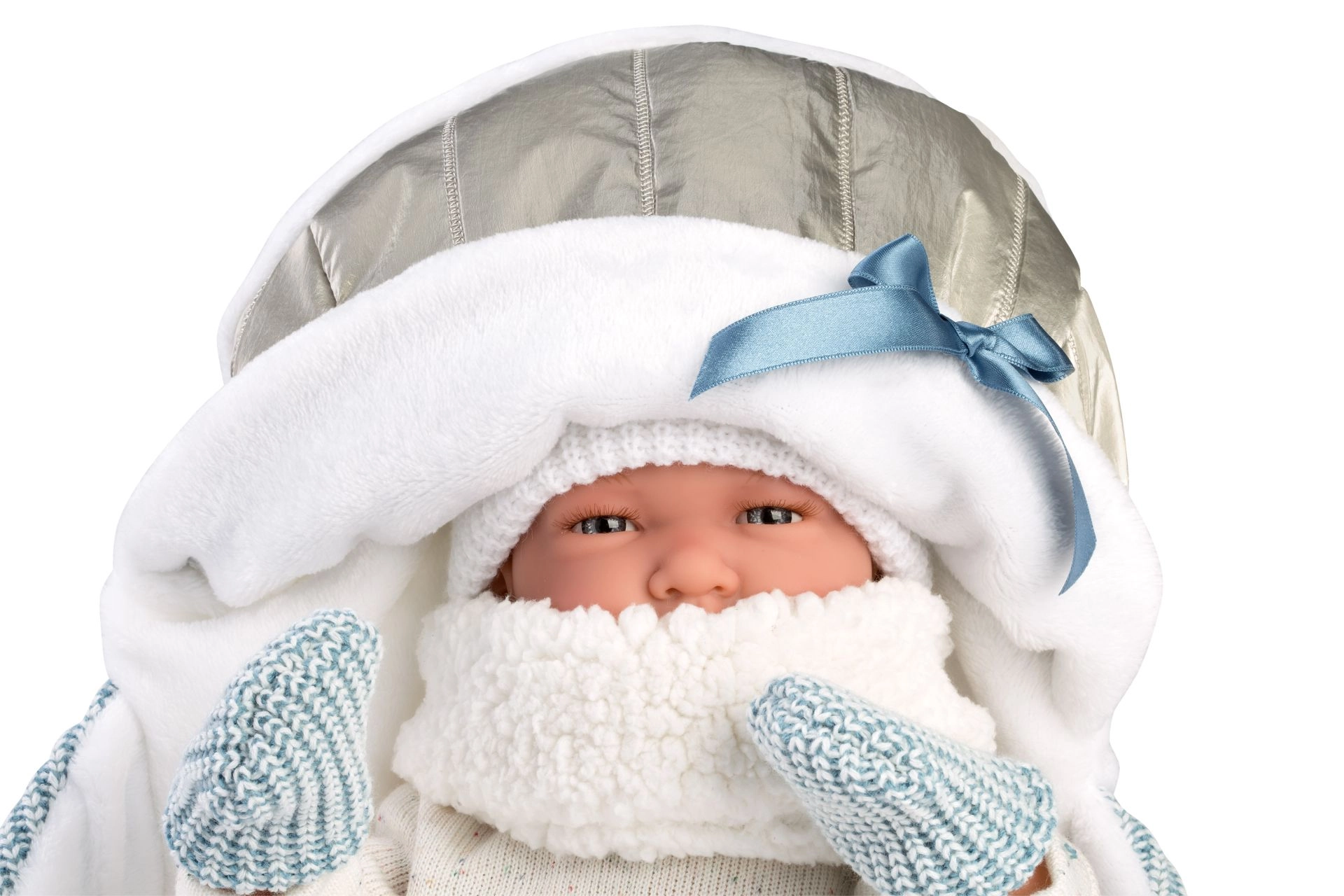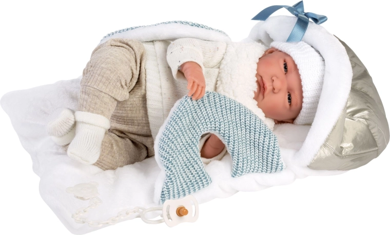 Stijlvolle 6-delige outfit met een zacht matje met capuchon en draagriemen voor NEW BORN-poppen in maat 40–42 cm. Handgemaakt in Spanje van aangename stoffen, eenvoudig aan te trekken en te onderhouden. Ideaal voor zorgspel en het stimuleren van de fantasie van kinderen vanaf 3 jaar.