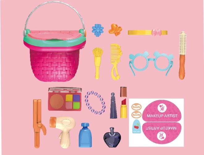 Ontdek de magie van make-up en haarverzorging met deze schattige speelset in een praktisch mandje. Je vindt erin maar liefst 18 accessoires, zoals parfum, lippenstift, oogschaduw, een föhn en haaraccessoires – ideaal voor creatieve spelletjes en het stimuleren van de fantasie.