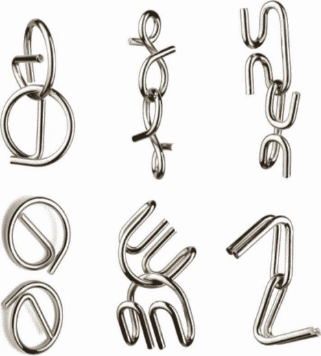 Set van metalen puzzels voor slimme koppen. De set bevat: