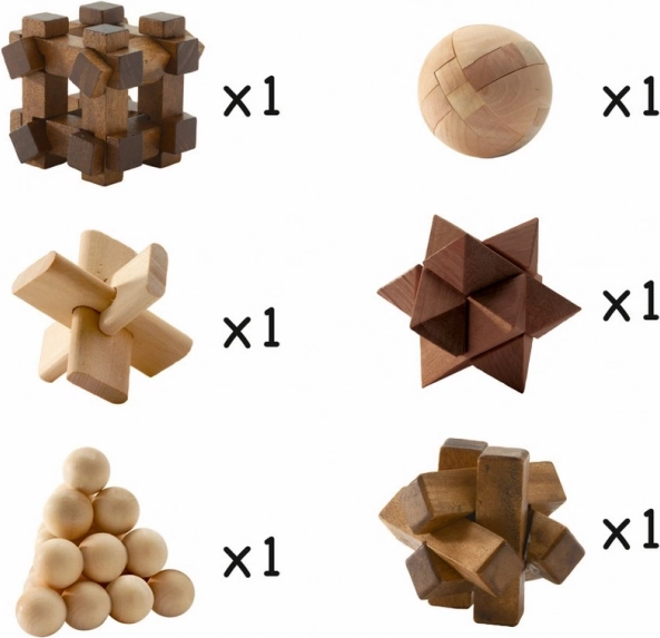 Set houten puzzels voor slimme koppen. De set bevat: