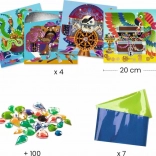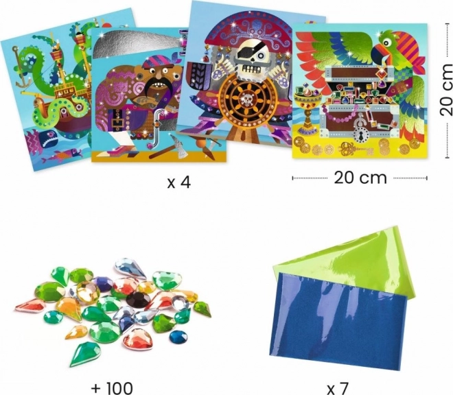 Breng piratenavonturen tot leven met deze collage-activiteit die elke kleine kunstenaar zal vermaken. Uw kinderen kunnen zich verheugen op het versieren van 4 afbeeldingen met piratenthema met behulp van folies en steentjes.