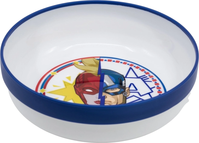 Praktische kinderkom AVENGERS van STOR met een antislipbodem die stevig op een glad oppervlak blijft staan. BPA-vrij, mag in de magnetron en ideaal voor dagelijks gebruik – kinderen zullen ervan houden dankzij hun favoriete helden.