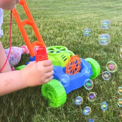 Deze kleurrijke WOOPIE bubbelgrasmaaier tovert elke middag in de tuin om tot plezier. Dankzij het automatische blazen van bubbels en het realistische ratelen van de wieltjes kunnen kinderen eenvoudig het werk van volwassenen nadoen, terwijl ze hun balans en coördinatie oefenen. De stabiele beugel zorgt voor makkelijk duwen en sturen.