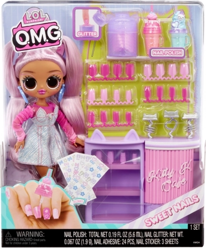 De L.O.L. Surprise O.M.G. Sweet Nails Kitty K Café set combineert mode, beauty en rollenspel. De pop met gearticuleerd lichaam en opvallend kapsel zorgt voor stijl, terwijl de thematische koffiebar met toog, taptuitjes en mini-koelkast uren speelplezier biedt. Inclusief accessoires voor gedecoreerde manicures – van vijl en stickers tot glitters en lak.