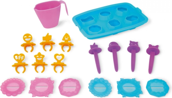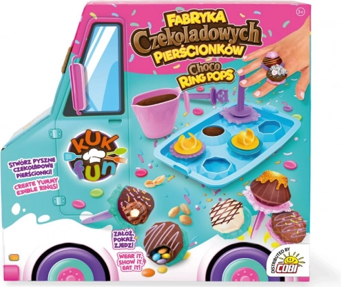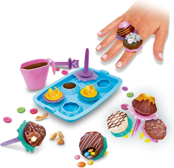 Maak heerlijke chocoladeringen en draag ze als sieraad! Vul de mal met gesmolten chocolade, voeg er zoete extra’s aan toe, zoals crispies, smarties, nootjes (chocolade en extra’s zijn niet inbegrepen). Plaats de ringbasis in de mal, zet het geheel in de koelkast en wacht tot het stolt. Nu is het tijd voor de ringen-show: schuif ze om, laat ze zien, eet ze op!
