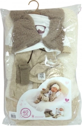 Stijlvolle en kwalitatieve kledingset voor de NEW BORN-pop in maat 40–42 cm met alles wat je nodig hebt voor comfortabel omkleden en spelen. Bevat 5 delen, inclusief een dubbelzijdig kussentje/matje, is handgemaakt in Spanje en wordt geleverd in een praktische verpakking met een plastic kleerhanger. Ideaal voor kinderen vanaf 3 jaar.