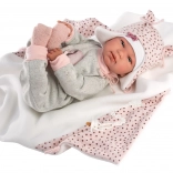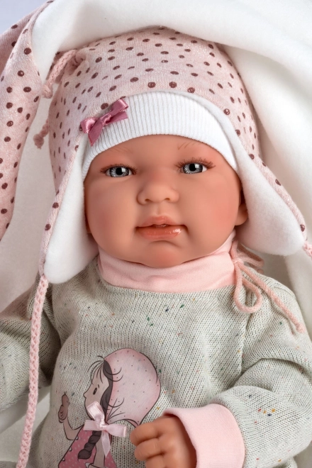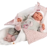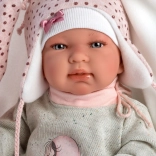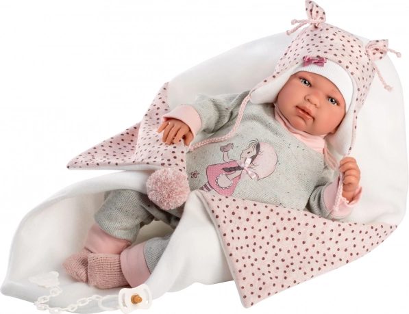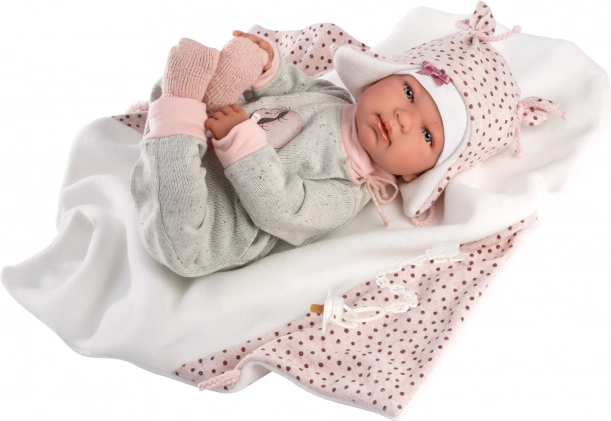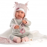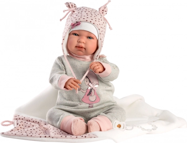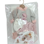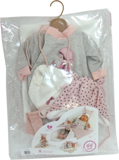 Stijlvolle 4‑delige outfit voor NEW BORN-poppen van 43–44 cm met een zachte roze‑grijze combinatie, een zachte deken met pompon om te strikken en hoogwaardige handgemaakte Spaanse afwerking. Praktische verpakking op een kunststof hangertje in een transparante hoes en veilig ontwerp voor kinderen vanaf 3 jaar.
