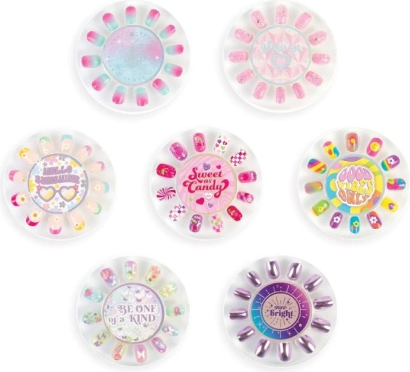 Met deze set van valse nagels Totally Trendy beschik je over talloze mogelijkheden om je creativiteit te uiten. Bevat zeven afzonderlijke sets nagels die je gemakkelijk kunt kiezen op basis van je stemming en stijl. Elke set bevat 12 nagels in twee duimformaten voor comfort en flexibiliteit.