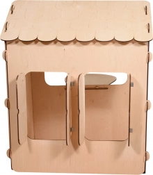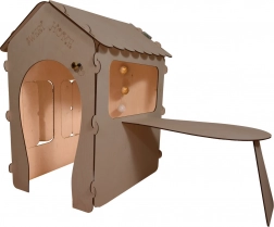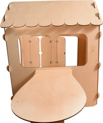 Het huisje heeft ook een praktisch tafeltje waar kinderen kunnen spelen of knutselen. Het is gemaakt van hout met een natuurlijke uitstraling, wat een esthetische en warme look geeft die past in elke tuin- of binnenruimte.