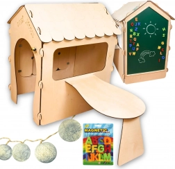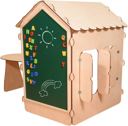 Het huisje bevat een ruim magnetisch-krijtbord voor leerzame spelletjes met vele letters.