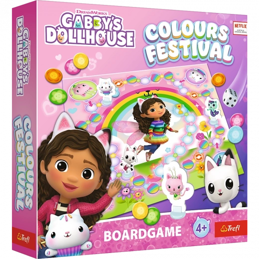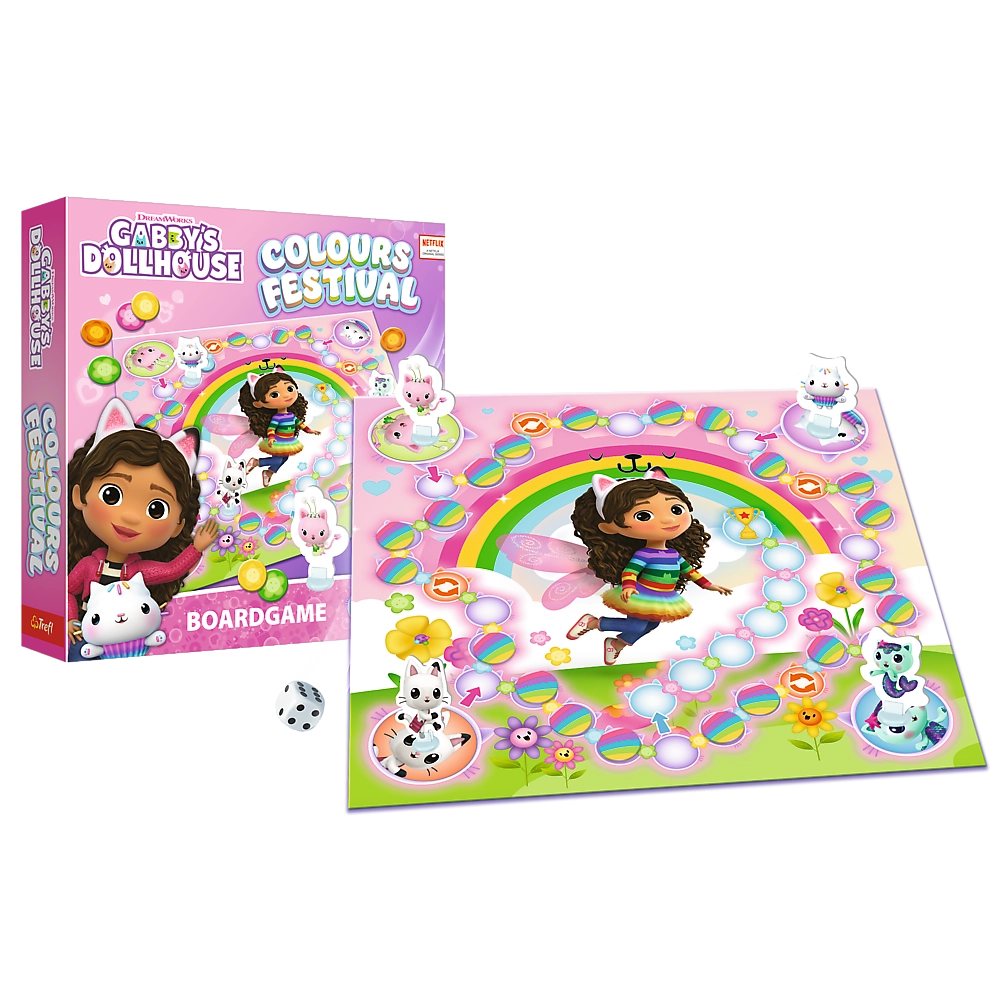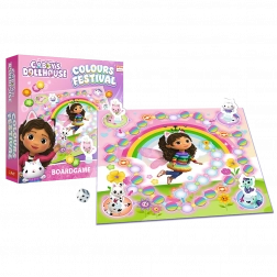 Stap in de wereld van GABBY'S DOLLHOUSE en beleef een kleurrijk avontuur voor het hele gezin. Het doel is om je zetten slim te plannen, fiches in vijf kleuren te verzamelen en zo de weg naar het Festival van Kleuren te openen, waar Gabby al wacht. Eenvoudige regels en een vlot speeltempo garanderen plezier voor kinderen en volwassenen.