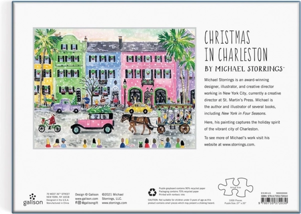 Ontdek de charme van de schilderachtige straten van Charleston tijdens het kerstseizoen dankzij de puzzel Kerst in Charleston van Michaela Storrings. Dit kunstwerk biedt niet alleen een geweldige manier om te ontspannen, maar ontwikkelt ook uw logisch denken en oog voor detail.