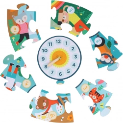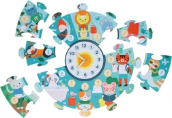 In het midden van de puzzel zit een grote klokplaat met verstelbare wijzers. Kinderen oefenen zo spelenderwijs het aangeven van uren en minuten en koppelen spelen aan praktisch leren.