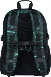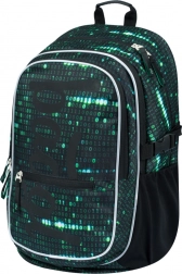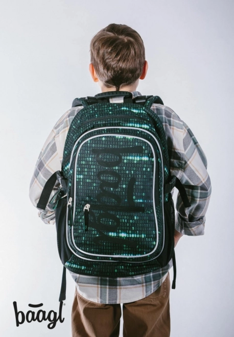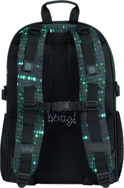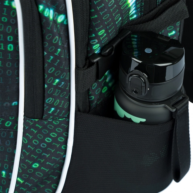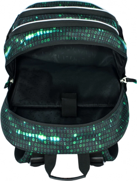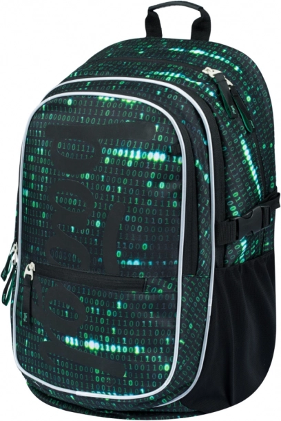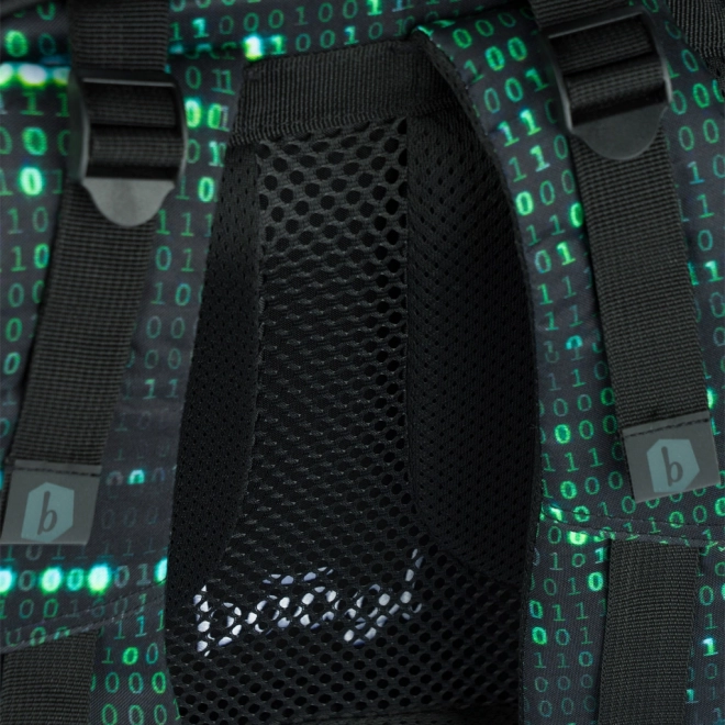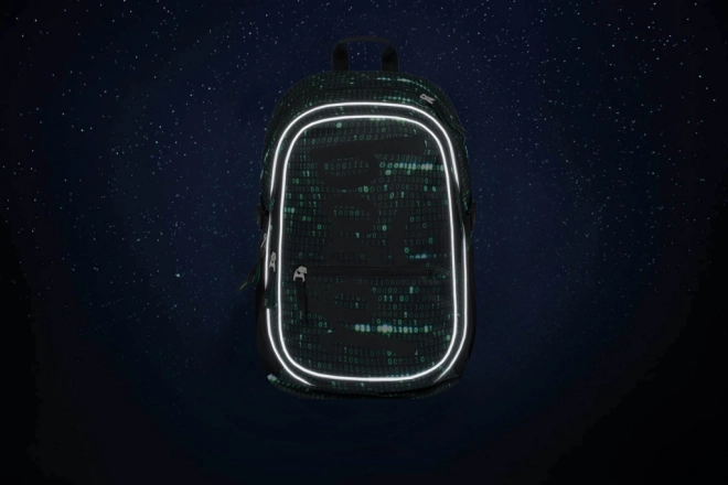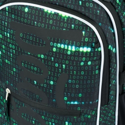 Deze rugzak valt op door een uniek ontwerp met een binaire codeprint in groen en zwart, dat de aandacht trekt van elke technisch georiënteerde student.